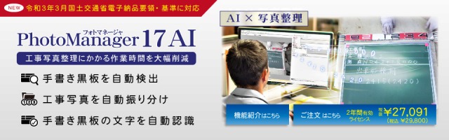 弊社で開発した「PhotoManager17 AI(フォトマネージャ)」は、AIの画像解析機能を搭載した工事写真管理ソフトです。