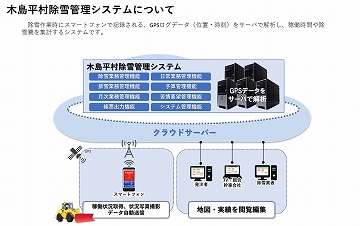 「木島平除雪管理システム」は、除雪業務時にスマートフォンで稼働時間や除雪・散布した路線を記録し、記録したデータをクラウドサーバで解析することで、システム内に稼働時間や除雪した軌跡が作業報告に反映され、作業日報が自動で作成されます。