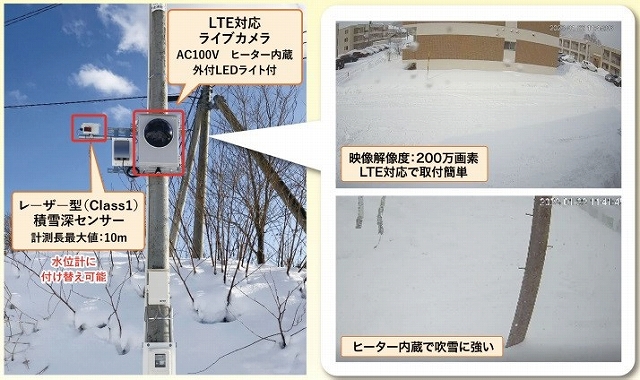 「積雪状況監視・自動発報システム」は、レーザー型積雪深センサーとLTE対応ライブカメラを用いることで積雪状況を監視します。