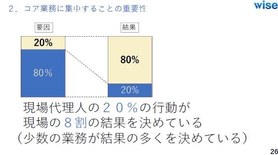 講習は2部構成で行われ、第1部では「現場代理人のコアスキルに集中することで生産性を向上させる」と題して、コアスキルに集中することの重要性や