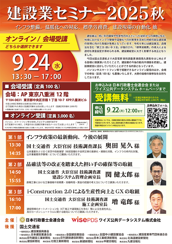 研修の中でもご案内しましたが、9月24日(水)に日本行政書士会連合会様との共催により「建設業セミナー2025 秋」を開催いたします。