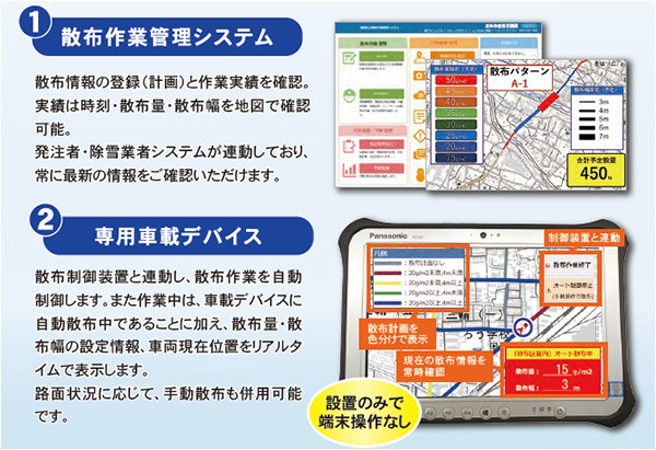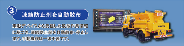 凍結防止剤自動散布車とクラウド型のシステムの連動により、散布作業を自動制御。