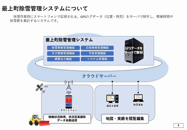 「最上町除雪管理システム」は、除雪業務時にスマートフォンアプリで稼働時間や除雪・散布した路線を記録し、記録したデータをクラウドサーバで解析することで、システム内に稼働時間や除雪した軌跡が作業報告に反映され、作業日報が自動で作成されます。