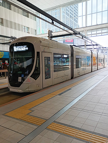 路面電車は駅前大橋を経由するルートに変更し新駅ビルの2階に乗り入れるようになり、利便性が向上しています。