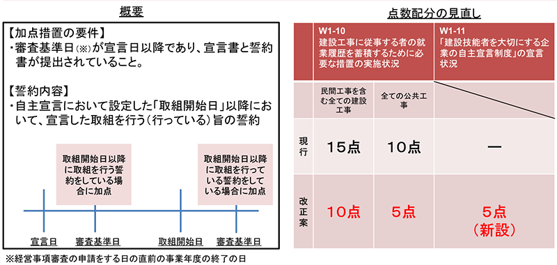 それに伴い、新たに「建設技能者を大切にする企業の自主宣言制度」についての加点項目を追加し、合わせて点数配分の見直しが行われる。