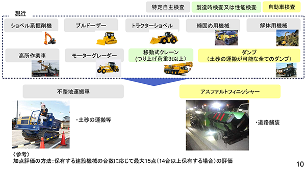 建設業者向けアンケートにおいて災害時における一定の活用実績が確認され、かつ、令和6年能登半島地震において活用実績が確認された建設機械のうち、定期検査による稼働確認等が可能な「不整地運搬車」「アスファルトフィニッシャー」を加点対象機械として追加する。