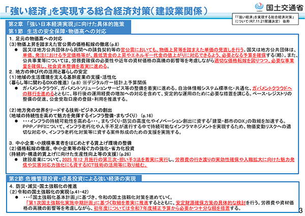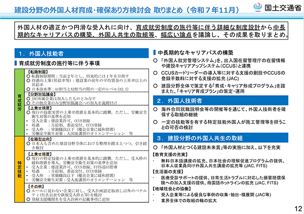 2025年12月2日 国土交通省 中央建設業審議会総会が開催され、今月12日の第三次・担い手3法の全面施行に向けて、労務費に関する基準案、建設工事標準請負契約約款・経営事項審査の改正の方向性について議論がなされた。